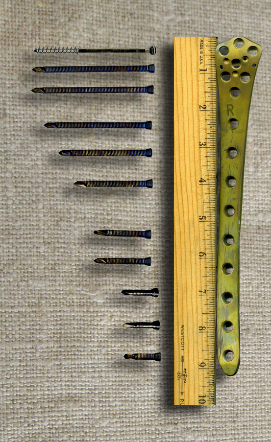 I went to see another surgeon about pain in my knee (can't imagine why I'd have troubles in my knee but I do) and when he saw that hardware in there from 2002 he said he couldn't do anything in the future until it was removed. So last week I had outpatient surgery on August 21, 2014, and it was removed. To the immediate, upper right is a photograph of what was in there all this time.