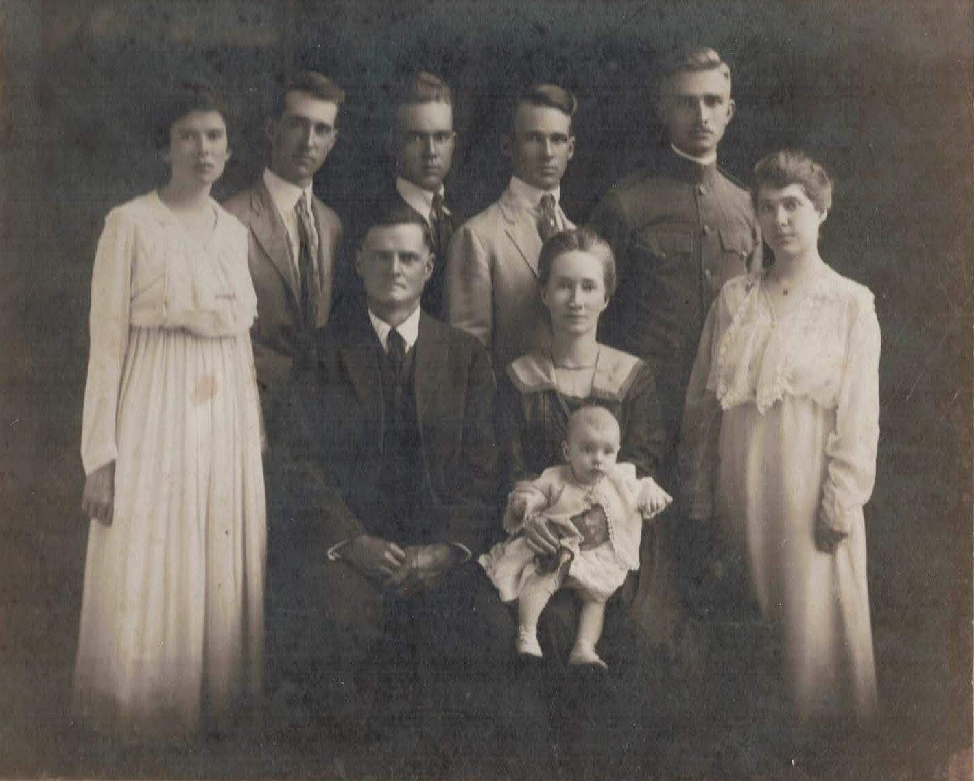 My father's family in 1918; Back Row, L-R: Ada Spargur (Dad's Mother, My Grandmother), Herschell Spargur (Dad's Father, My Grandfather); Gordon Spargur (Herschell's Youngest Brother); Granville Spargur (Herschell's Younger Brother); Irl F. Kennerly (Ada's Cousin and Husband of Herschell's Older Sister, Margene); Margene S. Kennerly (Herschell's Older Sister). Seated, L-R: Samuel Spargur (Dad's Grandfather, My Great Grandfather); Matilda Spargur (Dad's Grandmother, My Great Grandmother) holding my father, Vendrell L. Spargur.