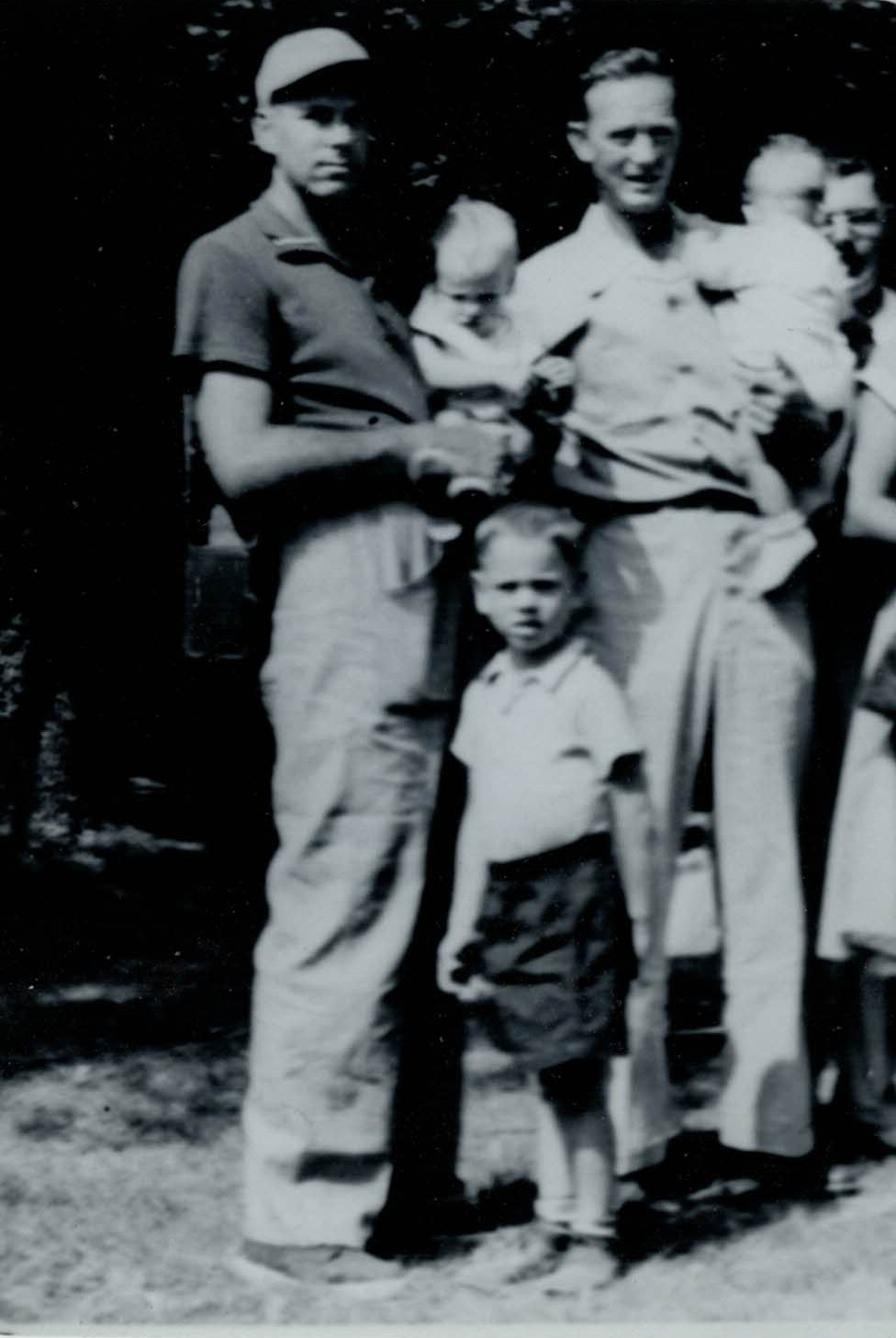This was taken at a Spargur family reunion at Serpent Mound in Southern Ohio in about 1953. Pictured are my Father (wearing a cap) holding my brother and Dad's cousin Gordon Spargur, Junior, holding his son (Larry). I, Dick Spargur (about age four), am the other child.
