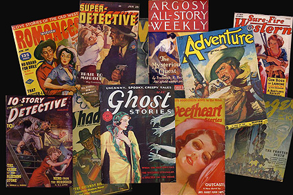 Pulp magazines pre-dated me by a number of years but their legacy is still felt. The pulps (as they're called) were generally 100% fiction magazines which began in about the early 1890s and lasted into the 1940s. At first the pulps were general interest magazines with something for every member of the family. In time, however, their audiences became very specific with some pulps being devoted to westerns, others containing science fiction and many other topics such as detective stories, mysteries, baseball, aviation, boxing, hunting, adventure, etc., etc. Hundreds of pulp magazine titles were created over the long period in which they were popular. Because this required a tremendous input of fiction, fiction often written by fledgling writers, the pulps quickly became a breeding ground for the writers of the twentieth century, almost all of whom first cut their teeth by first writing for pulp magazines. Here are a few sites where can be found electronic recreations of complete issues of past pulp magazines.