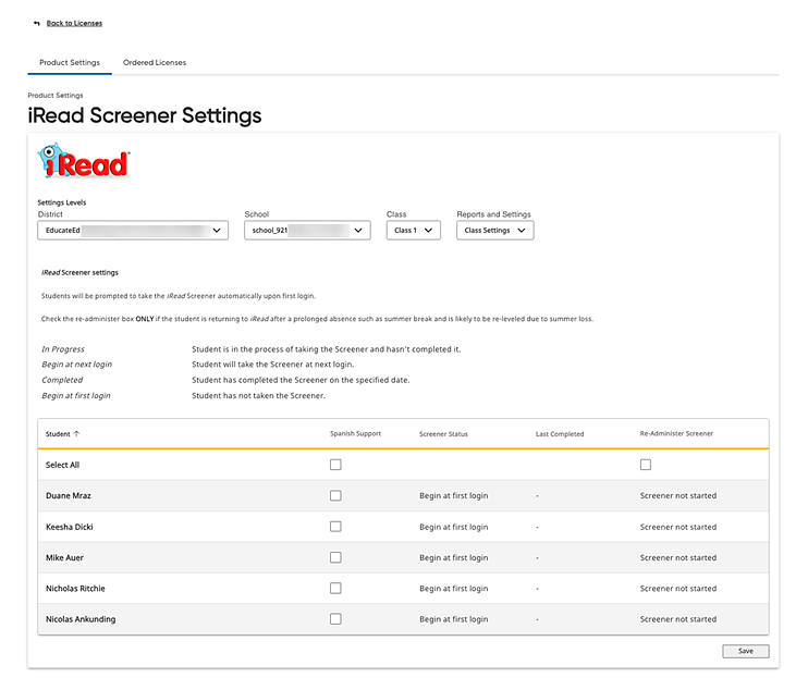 3. Click the Product Settings tab. The iRead Screener Settings page appears.