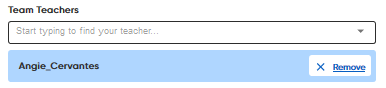 Note: The lead teacher and the team teachers both have the same capabilities to manage classes, including adding and removing students and creating assignments. ➔ Select a team teacher from the list or begin typing the teacher name and then select the teacher from the list. Multiple team teachers are allowed for a class. To add additional team teachers, select another team teacher.