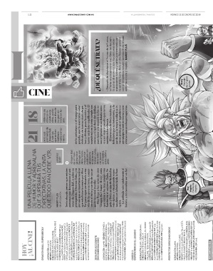 18 millones de dólares re- caudó esta cinta, a sólo once días de su gran es- treno en Ja- pón. de la caricatura o el manga para gozarla, aquí lo esencial es saber disfrutar de buenas dosis de pe- leas y chistes, pues la acción y el humor están bien equilibrados. El soundtrack en la cinta cumple con creces y ni qué decir del doblaje, pues tener a la mayoría de las vo- ces originales es un deleite sono- ro y un viaje al pasado que revive El personaje de Broly resulta sa- tisfactorio por su tratamiento, a la par de que la mayoría odiará su in- menso poder, pues el legendario su- per saiyajin no
