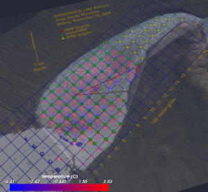 Through the Geo Data panel it is possible to set the batymetric model opacity, and display an annotated aerial image of the lake on top of the datapoints. It is possible to observe how the sonde drop positions map pretty well with the grid points.