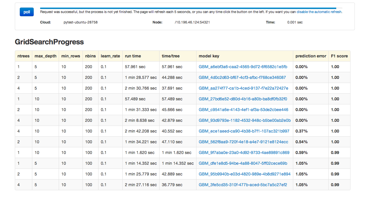 Grid analysis results return a table indicating the level at which each of the tuning parameters were tested in combination and a clickable model key for each. If users specify 3 different levels for Ntrees, and 4 levels for Max Depth, a total of 12 models will be displayed; there is one model for each unique combination of specified tuning parameters.