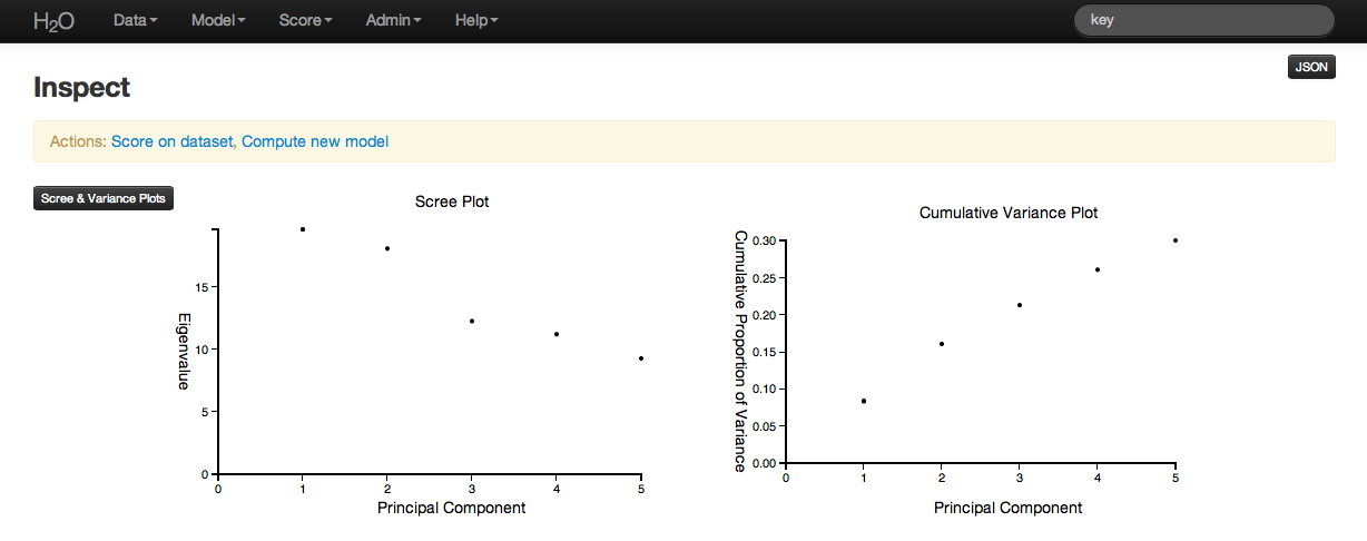 Scree and cumulative variance plots for the components are returned as well. Users can access them by clicking on the black button labeled “Scree and Variance Plots” at the top left of the results page. A scree plot shows the variance of each component, while the cumulative variance plot shows the total variance accounted for by the set of components.