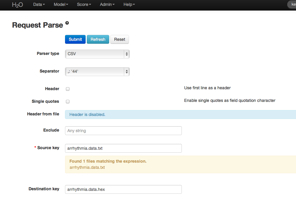2. In the Key field enter the .hex key for the Arrhythmia data set.