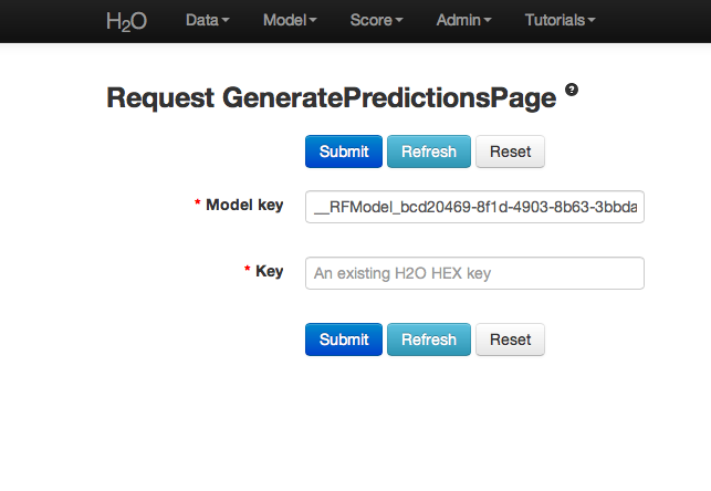 Using the predict function requires the .hex key associated with a model. To find this go to the drop down menu Admin and select Jobs.