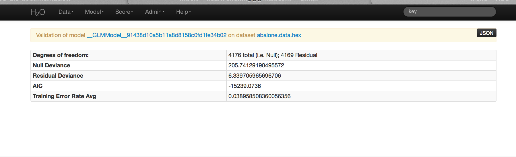 2. If you clicked the Predict! link on the GLM results page, the model .hex key is entered automatically. Otherwise, enter the model .hex key in the “model” field.