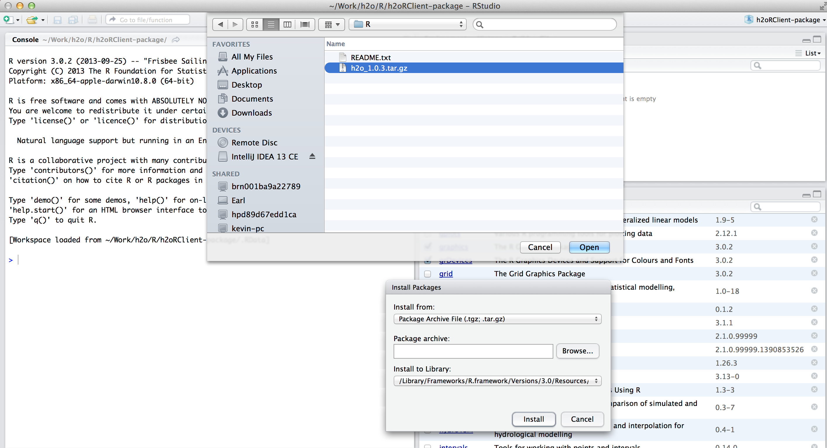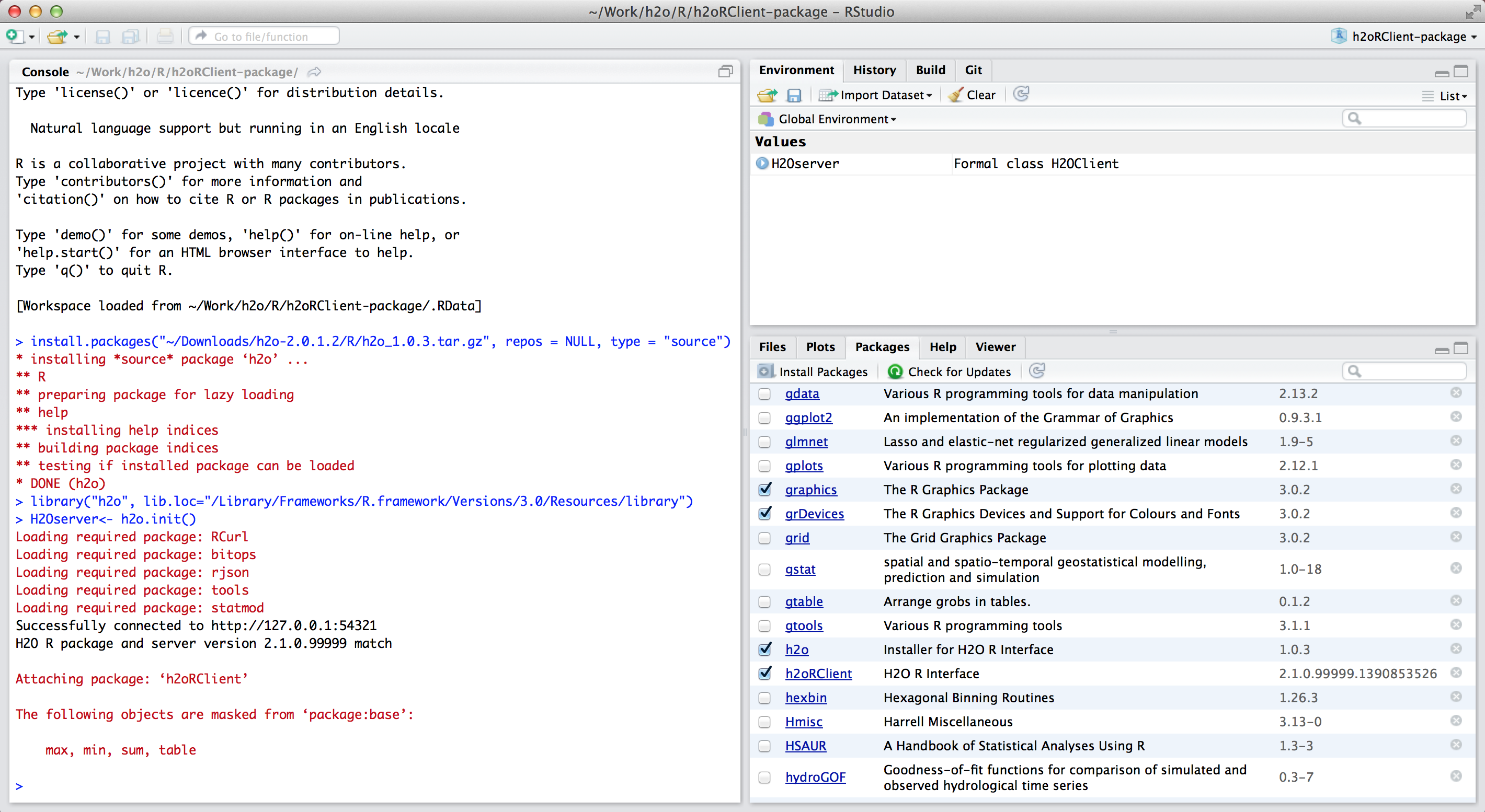 Install the H2O package, and the H2O client package simultaneously by clicking on Install Package