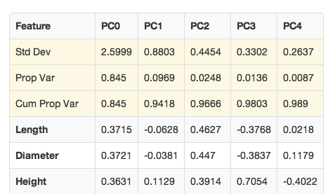 The results of PCA are presented as a table. An example of such a table is given below. In the simplest conceptual terms, PCA can be viewed as an algorithm that takes a given set of old variables, and performs transformations to yield a new set of variables. The new set of variables have useful practical application, as well as many desirable behaviors for further modeling.