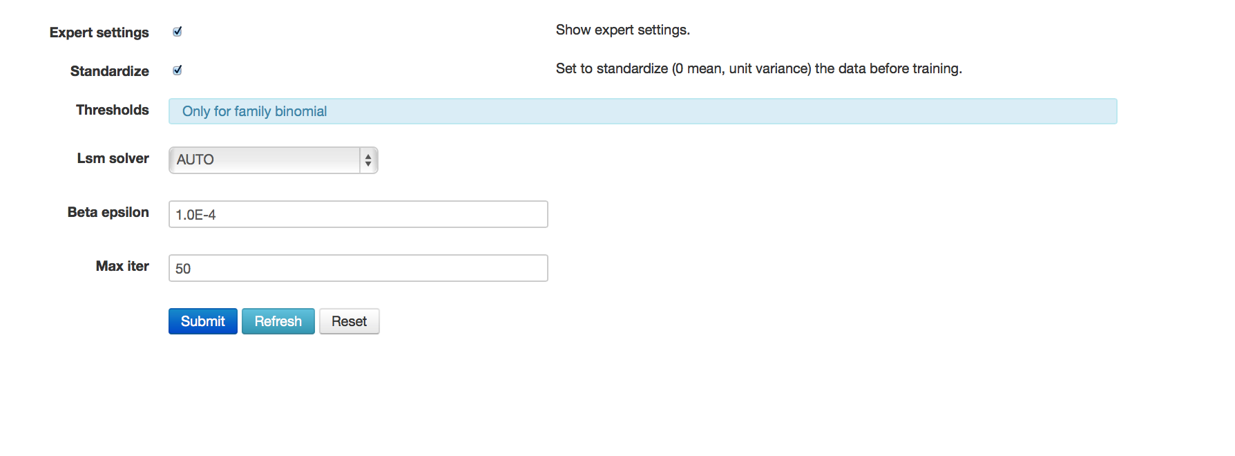 6. Set lambda and alpha to 0. These parameters determine regularization of GLM models. To find detailed information on the specification of tuning parameters see Generalized Linear Model (GLM).