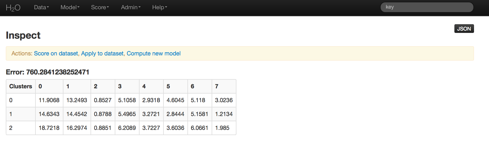 For further information on the model select K-Means from the drop down menu Score. Specify the K-Means model key, and the .hex key for the data set originally used.