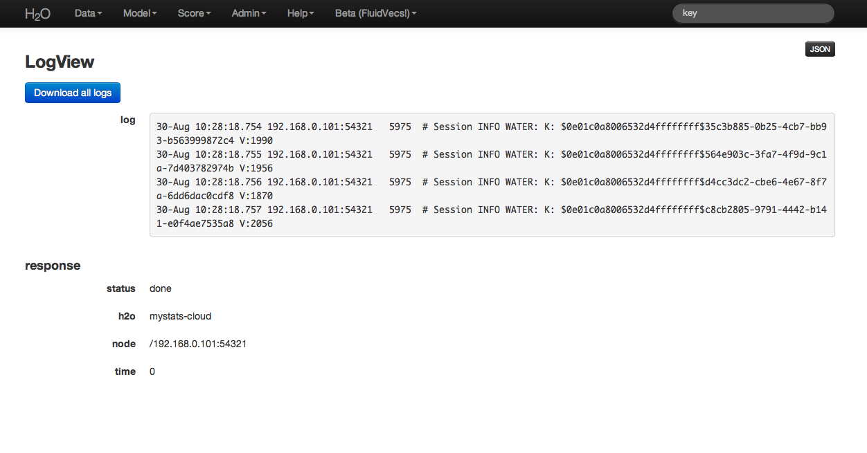 Full logs from any H2O work session can be automatically downloaded by clicking the “Download all logs” button in the upper left hand corner. When requesting help or reporting an error, please download logs, and contact us at support@0xdata.com with the logs attached.