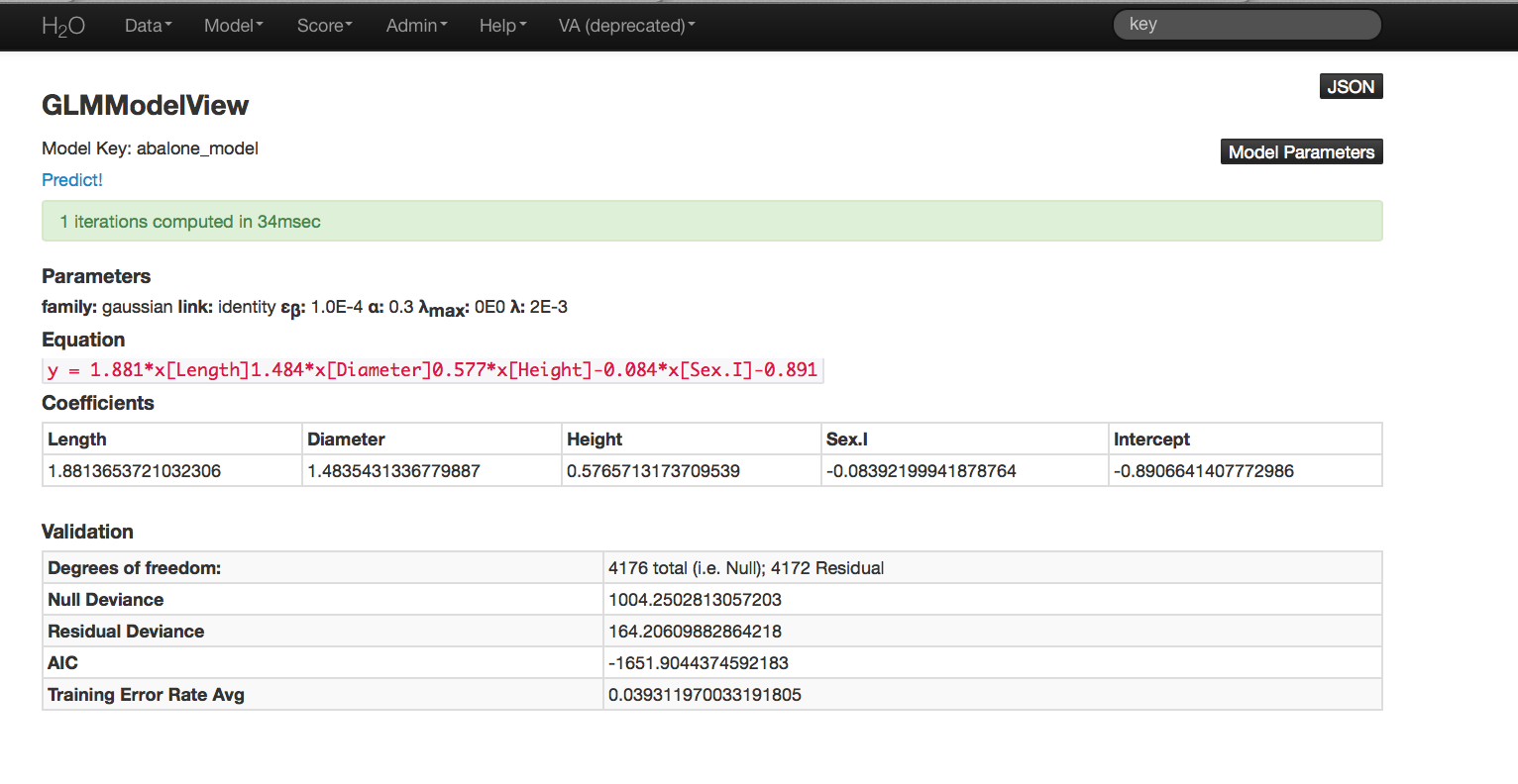 - In model key enter the .hex key found in the center of the GLM results page under the header Validations (this can also be found under the Admin drop down menu by selecting Jobs).