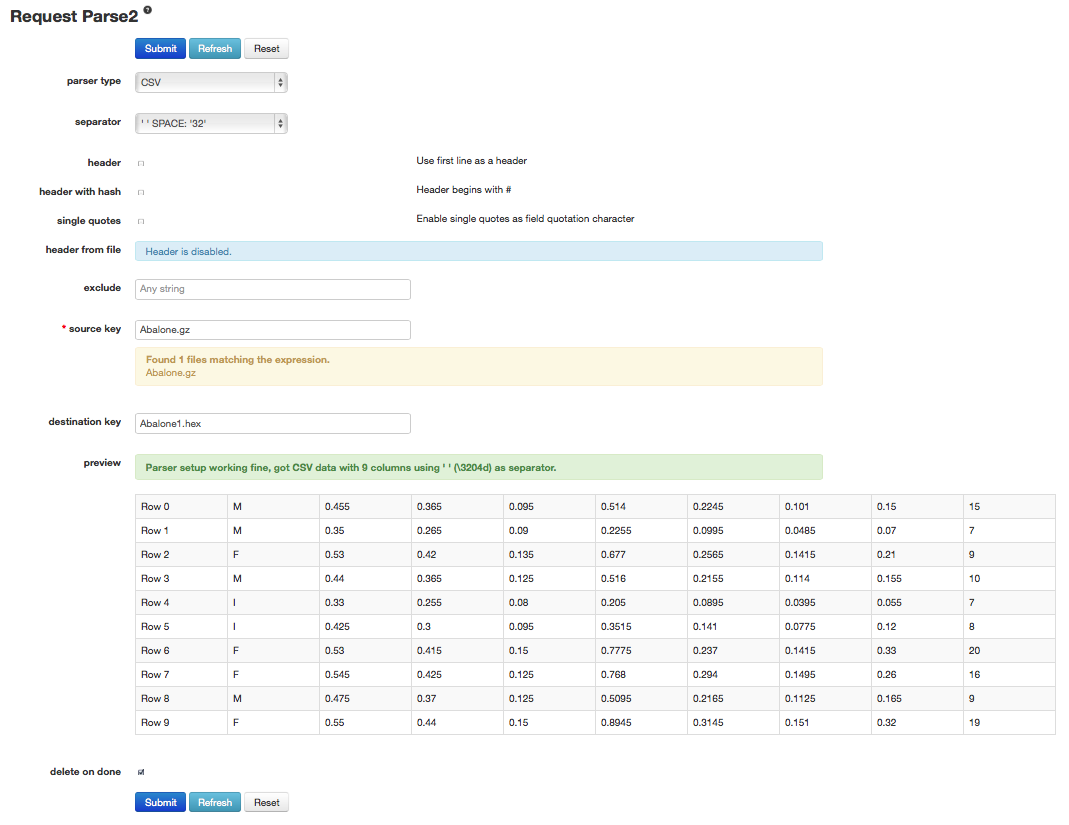 3. Click Submit. Parsing data into H2O generates a .hex key (“data name.hex”).