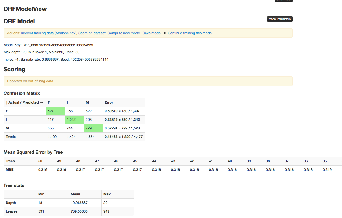 RF inspect also includes information about the specified tuning parameters at the top of RFView. To generate predictions for another dataset, click the “Score on dataset” link at the top of the page.