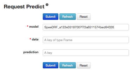 All jobs created in the current instance of H2O are listed here. Find the appropriate job (in this example, “Random Forest 150 Trees”). Save the associated key to clipboard, and paste it into the model key field on the “Request Generate Predictions” Page. Enter a .hex key associated with a parsed data set other than the one used to build the model.