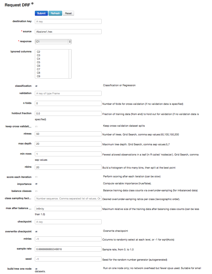 After parsing the data, select either Random Forest or BigData Random Forest from the Build models using... links at the top of the page. Select Random Forest to create a SpeeDRF model for classification, or select BigData Random Forest a DRF model that can be either classification or regression.