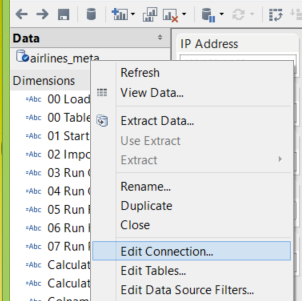 Set the workbook’s connection to the airlines_meta.csv data by navigating to the data section on the left sidebar, right-clicking on the airlines_meta, and choosing “Edit Connection.”