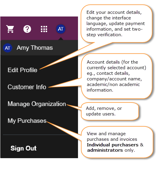NOTE A single user can have more than one account linked to their profile, with different roles for each account, e.g. an individual may have bought NVivo with their personal account, so have the role of an individual purchaser for this account, and been assigned a seat to Collaboration Cloud in another individual's account, so have an assignee role for this account.