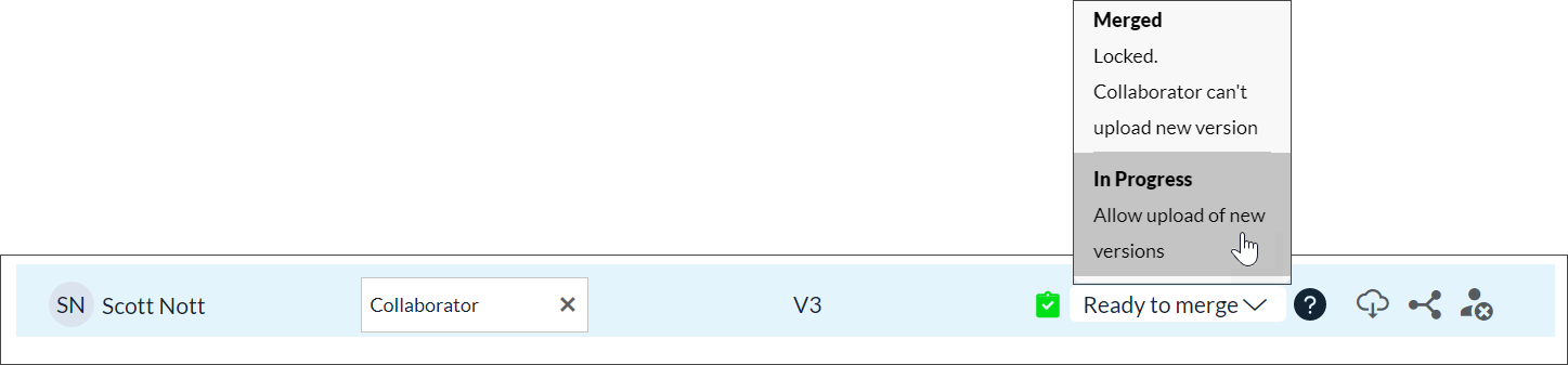 If the status is changed to merged the icon for the collaborator's most recent upload on the VERSIONS screen changes: