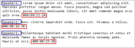 Speaker name and valid timestamp. The speaker name must be followed by a colon (:) and a space. In the example, the timestamps were inserted by the transcription software, F5.