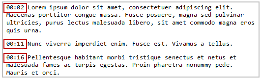 A 'timestamp' indicates a point in time. For example, two minutes (00:02:00) into an interview, Jane said, "I don't agree with the issues". You can enter timestamps as hh:mm:ss or mm:ss (where hh = hours, mm = minutes, and ss = seconds). Timestamps can optionally include tenths of a second.