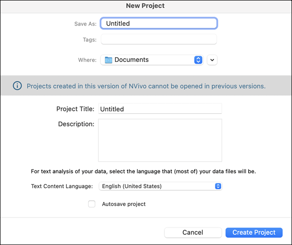 This is the language that the data files in the project (or most of them) will be in. It selects the correct dictionaries and other resources for textual analysis (e.g.text search) on your data. - Optionally turn on autosaving. Check Autosave project to turn on autosaving. (You can change this setting at any time in File > Project Properties > General)