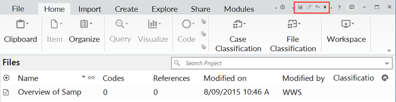 The Quick Access Toolbar allows you to place frequently used commands where they can be accessed without having to open a ribbon or menu. All NVivo commands are available for placement in the toolbar.