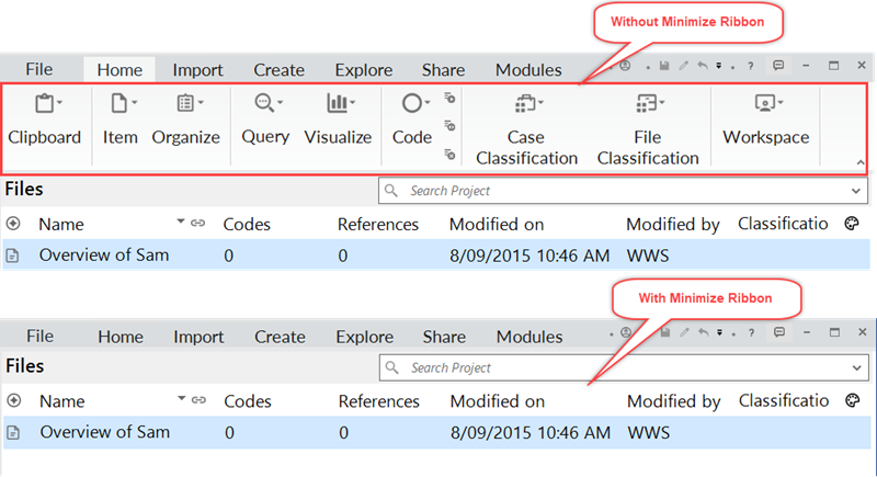 You can modify the NVivo interface to create more space for specific tasks or show the information most useful to you.