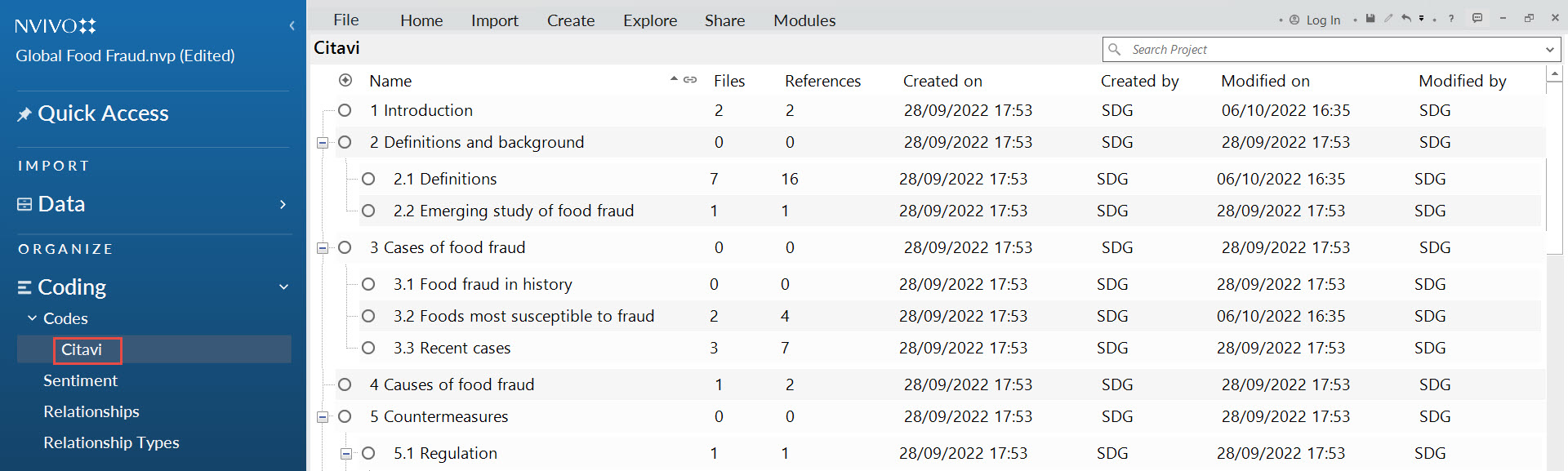 Categories are located under the Coding section inside the Citavi folder. All the categories and sub-categories from Citavi are imported as codes and sub-codes retaining the original hierarchy and sorted as per the original order in Citavi.
