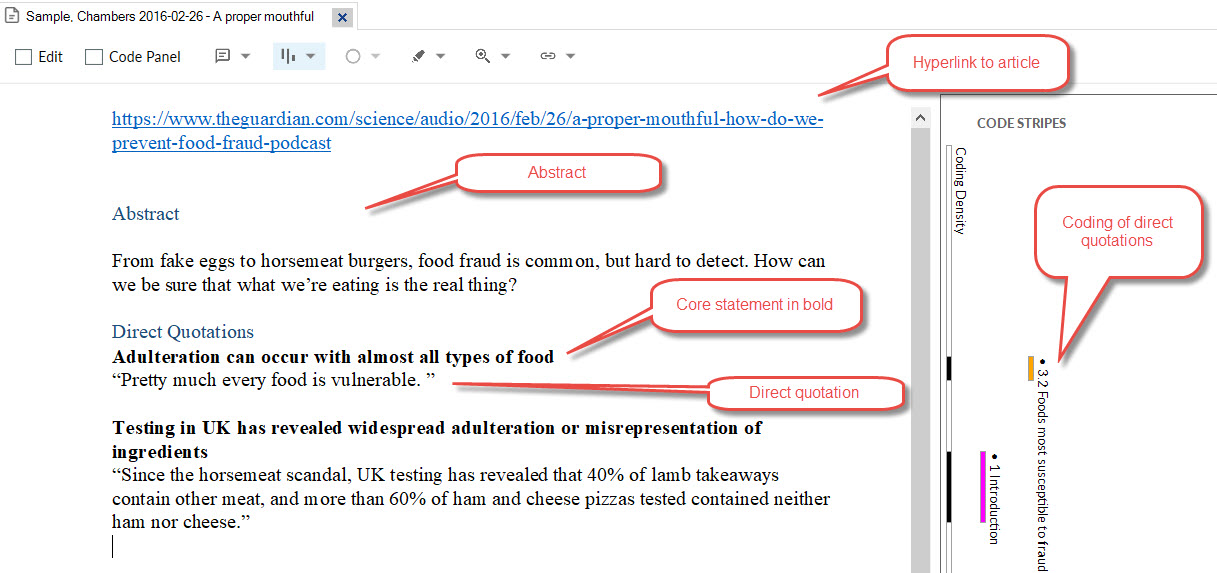 Direct quotations are brought into NVivo together with any user generated core statements. For more information, see References.