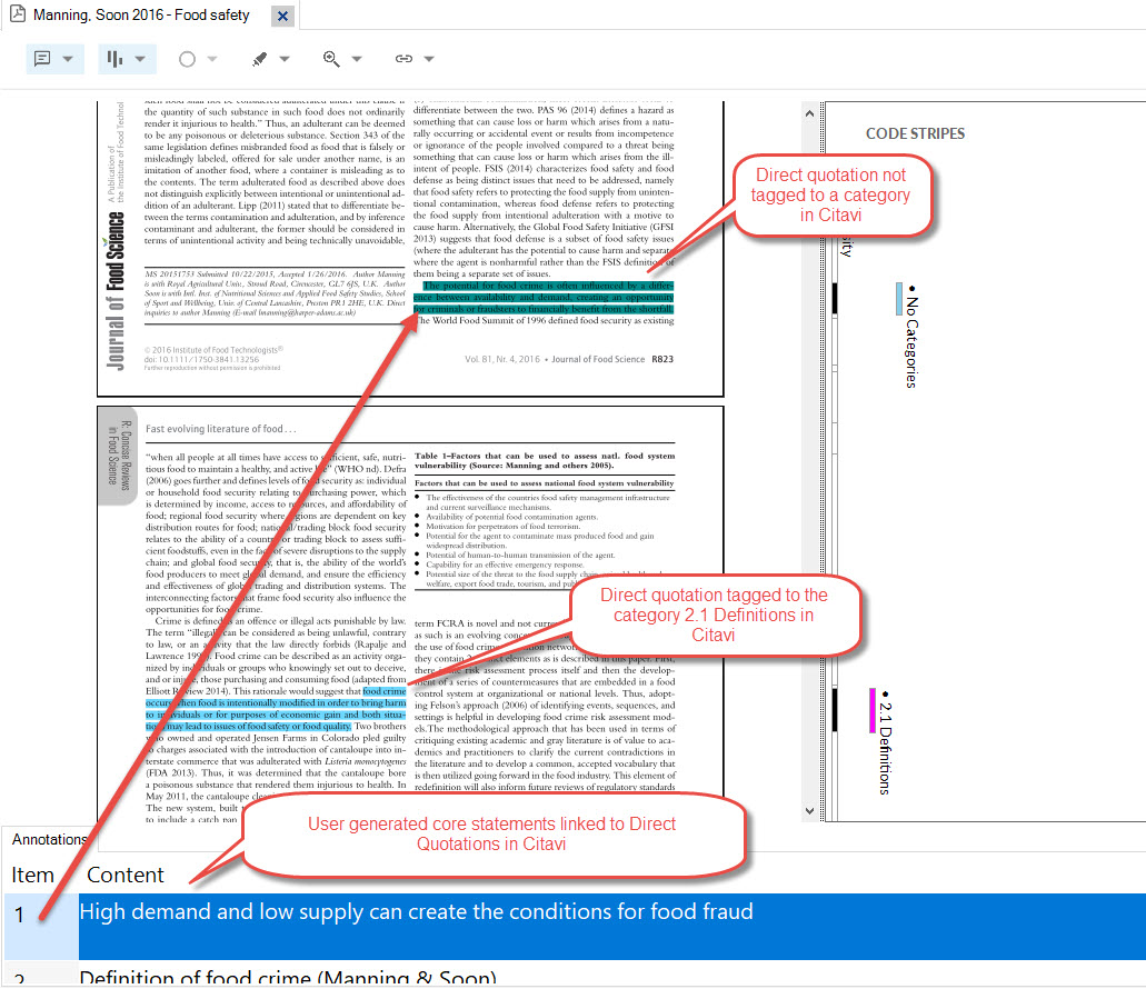 Direct quotations that are not linked to a Knowledge Organizer category are coded to the code No categories in NVivo. User-generated core statements for Direct Quotations become annotations in NVivo.