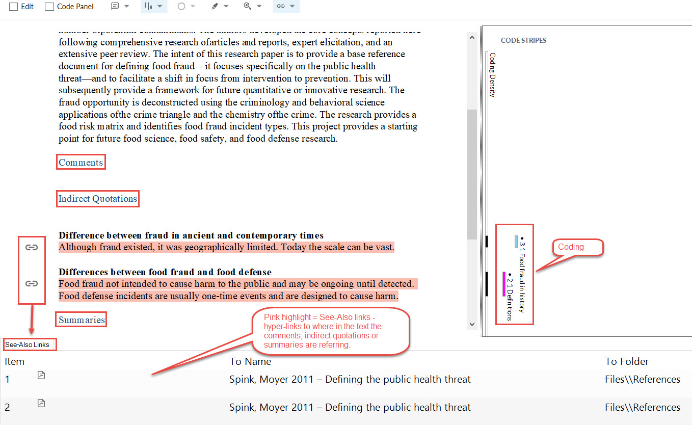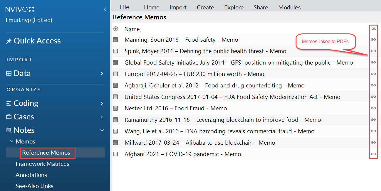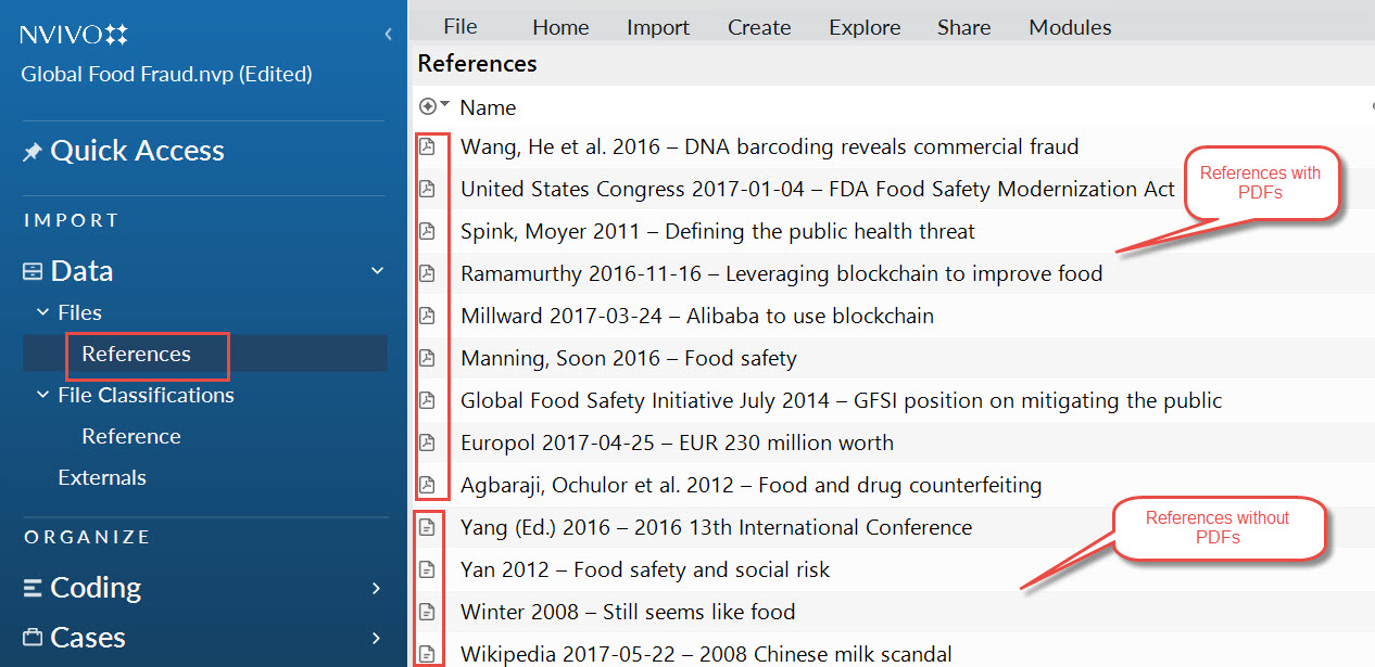 • References with PDF: The PDF is imported in NVivo. Direct quotations that are linked to a Knowledge Organizer category are coded to the relevant code in NVivo.