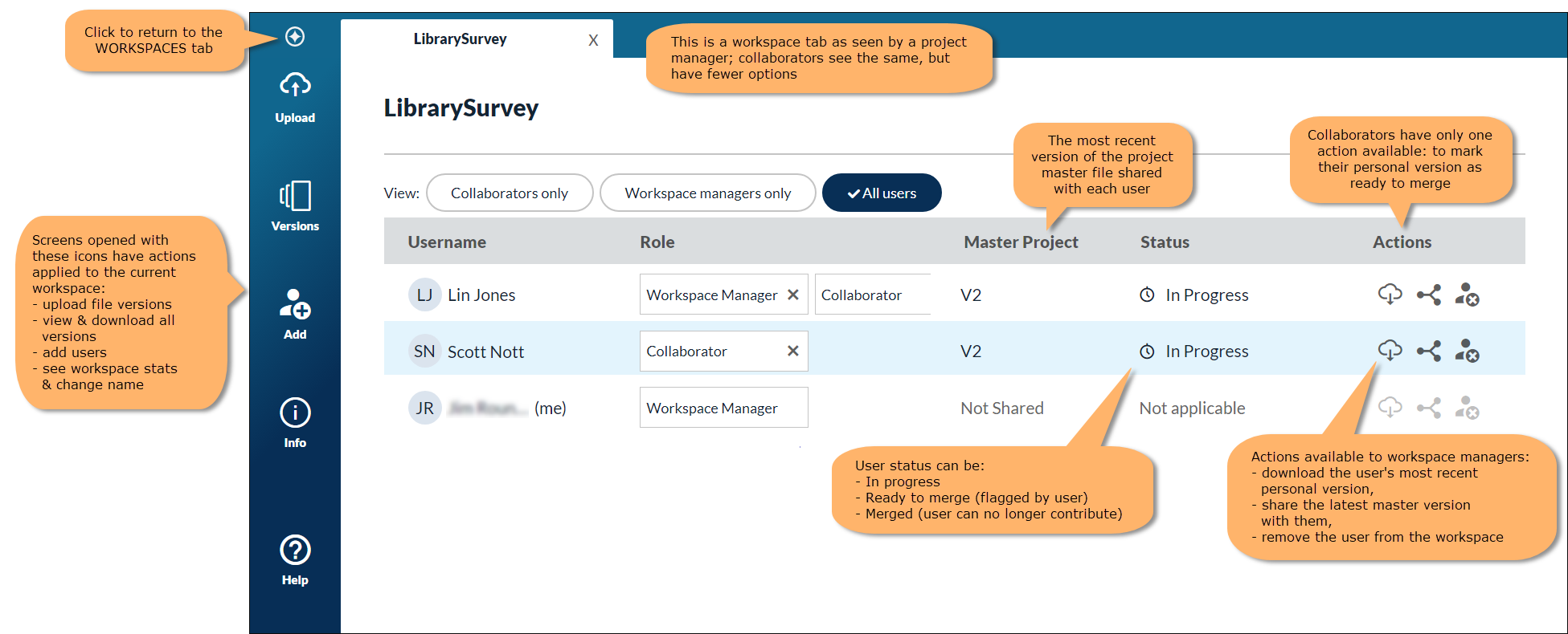 Workspace managers manage the users within a workspace. They also upload and share project file master versions and collect collaborators' work to merge into the master version.