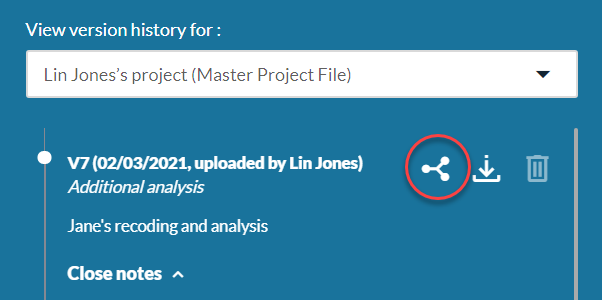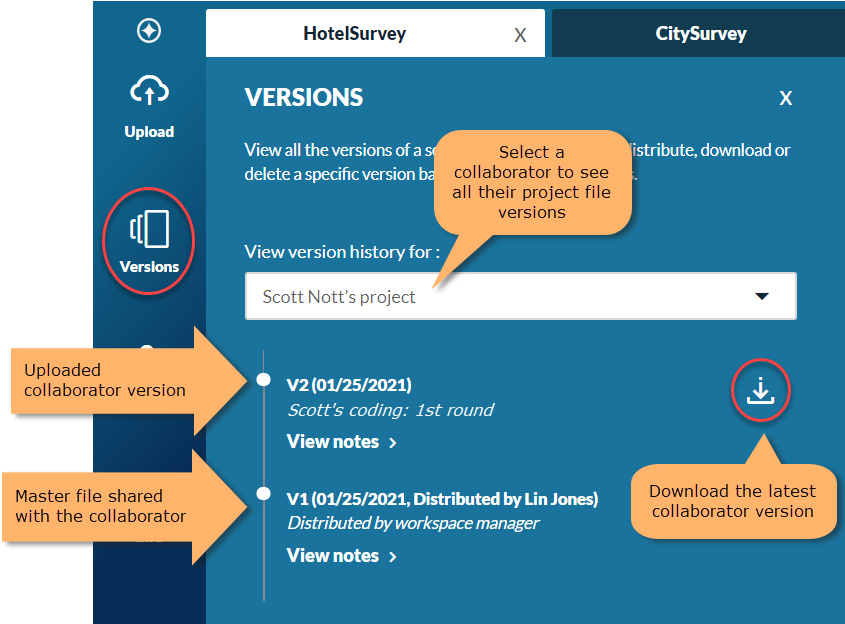 • Click Versions to view and download project file versions (and share them—workspace managers only)