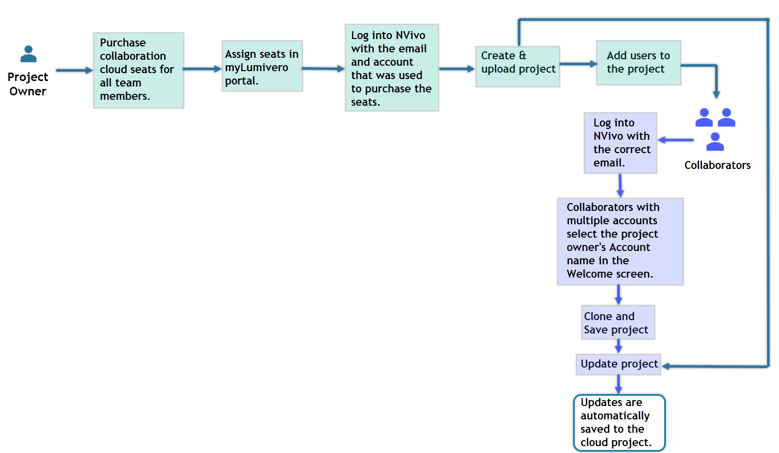 Collaborators are assigned to a project by the Project Owner. Collaborators need to have a Collaboration Cloud seat to work on the shared projects. They can work from either NVivo for Windows or NVivo for Mac.