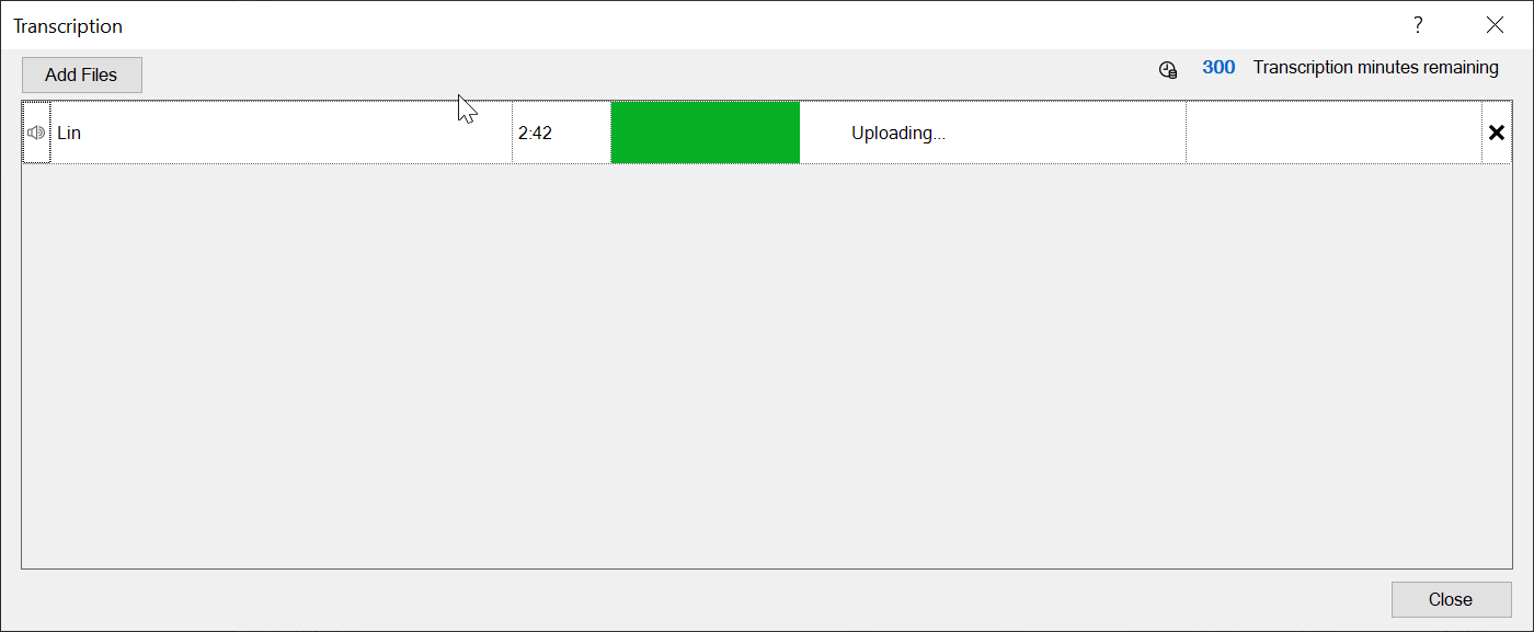 2. In the Transcription dialog box, click Add Files to add audio or video files to transcribe. Once added, the files automatically upload to NVivo Transcription on the web.