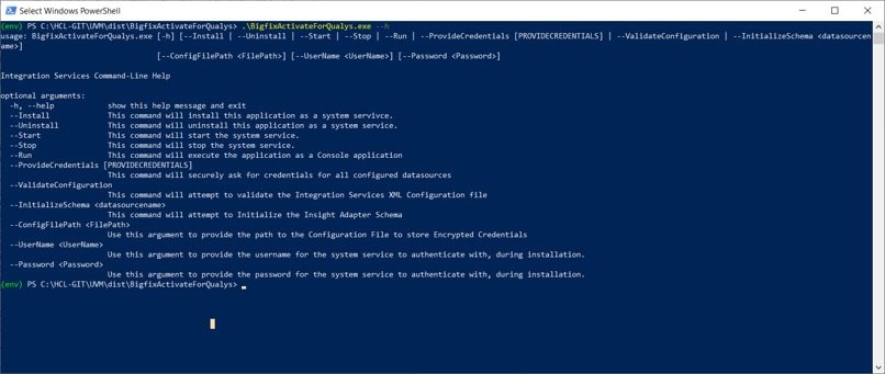 The Data Flow Service executable provides a Command Line Interface (CLI) that you can use to perform several different functions related to the setup and execution of the solution such as installing, uninstalling, starting and stopping the solution as a native system service, securely providing credentials for data sources, manually validating configuration before starting the service, and running the solution from the BigFix Console.