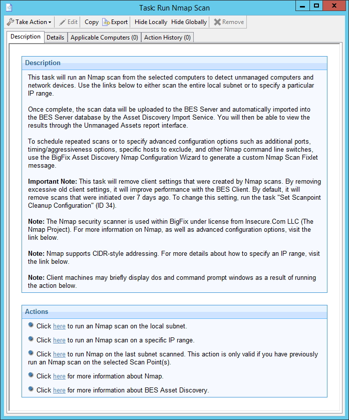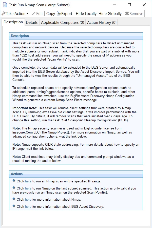When the task opens in the work area, select one of the available links in the Actions box to initiate the Nmap scan. You can specify a local subnet: