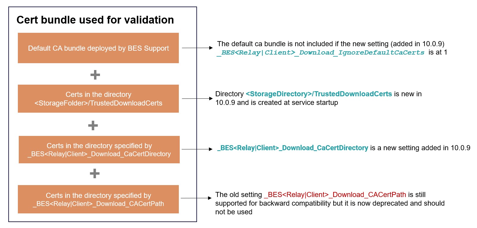 • _BESRelay_Download_IgnoreDefaultCaCerts (server/relay). It is a boolean setting with two possible values: 0 and 1. When set to 1, it tells the component to ignore the default ca-bundle.crt certificate bundle located under BES Support. The default value is 0.