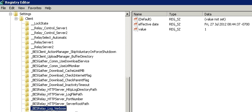 The effective current date time must be in a format similar to "Wed, 06 Jun 2012 11:00:00 -0700".[Software\BigFix\EnterpriseClient\Settings\Client\_BESRelay_Log_Verbose] effective date = [Enter Current Date Time In Standard Format] value = 1 - Start BESClient service with the