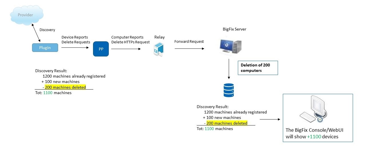 In the following example, the Plugin discovers 100 new machines and no longer detects another 200, so the Plugin Portal receives a new report for the 100 new machines and an empty report for the other 200 machines. For its part, the Plugin Portal must register new devices and remove undetected devices (Device alerts / Deletion requests arrow). With this new feature, the Plugin Portal will also send an HTTP delete request for the devices that are no longer detected (Delete HTTPs request arrow). The Relays will forward the request to the BigFix Server, which is in charge of performing either a physical or a logical deletion (depending on the new plugin setting introduced and already described above) of the 200 undetected devices from the BigFix database. What happens is that the removed devices will not be displayed in the BigFix Console and in the WebUI computer list and the BigFix Console and the WebUI will always show the list of the actually detected devices.