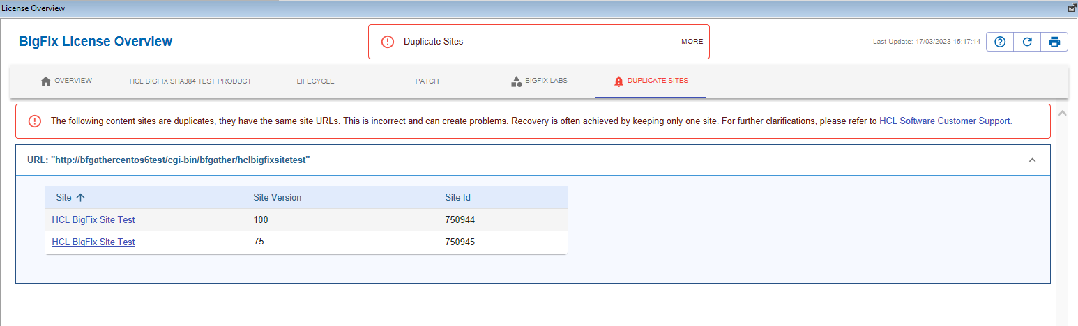 If a URL is, by accident, associated to multiple sites, then the License Overview Dashboard warns you about the anomaly, presenting an error message. As of BigFix 11, the License Overview Dashboard handles the inconvenience and provides with an additional help to identify what the duplicated sites are, via a new tab named Duplicate Sites.