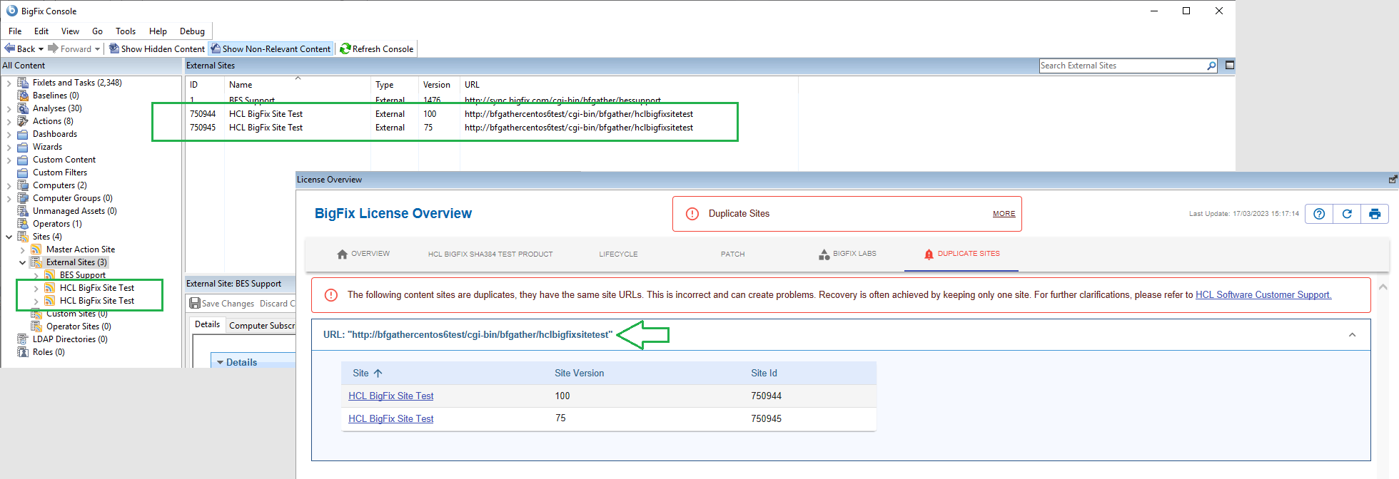 In BigFix the relationship between Sites and URL should be managed into a one to one correspondance.