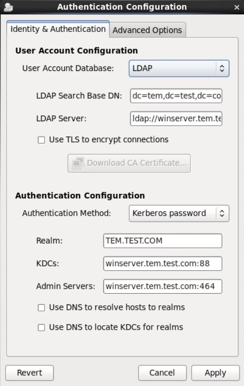 ldap://winserver.tem.test.com - In Authentication Method select Kerberos password.