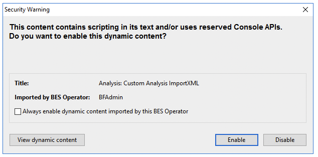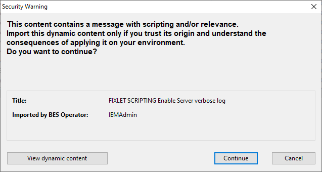 Starting from BigFix Version 10.0.8, when importing a Fixlet, Task, Action or Baseline which has in its Description tab some dynamic content, the following security warning is displayed:
