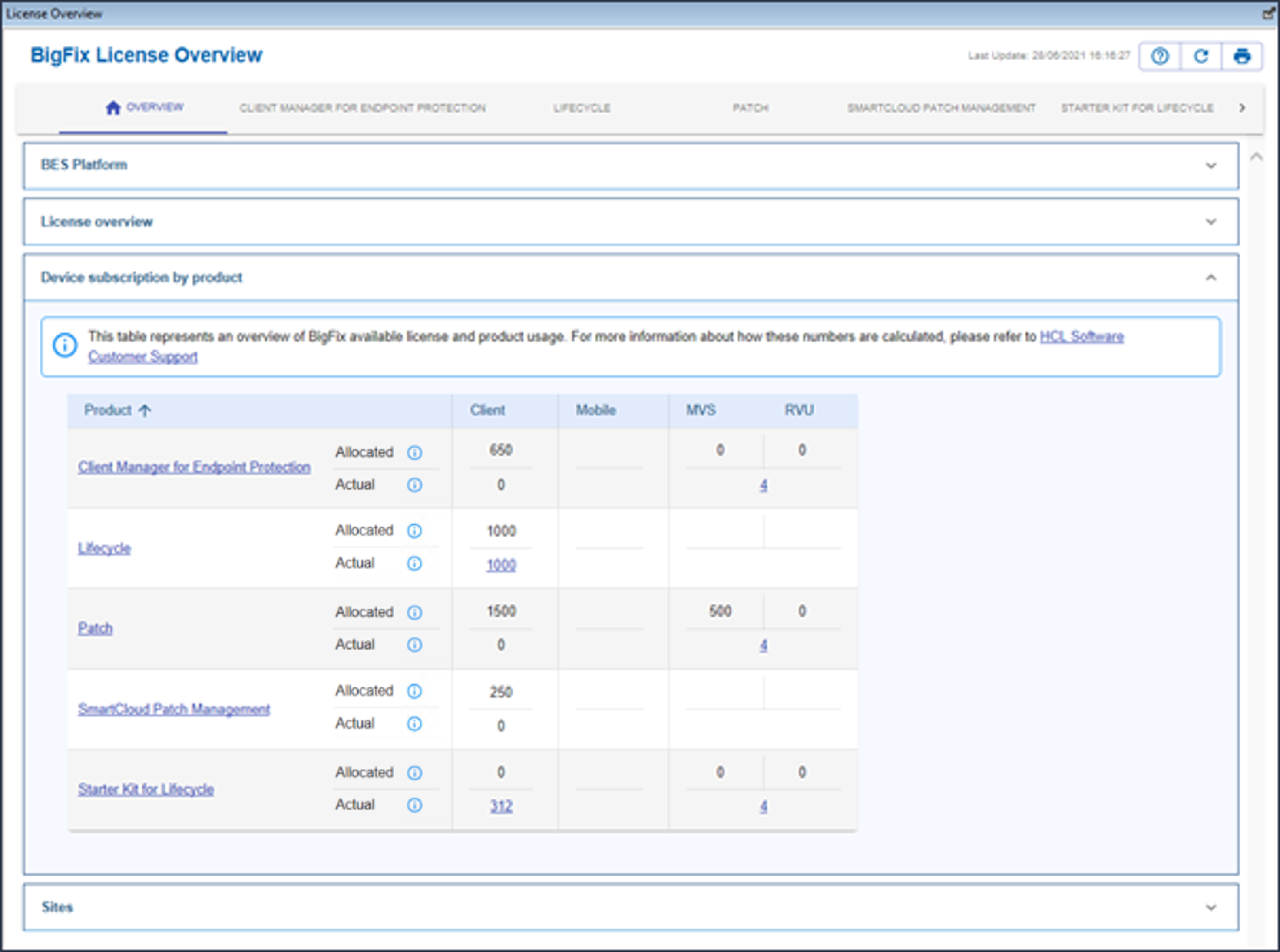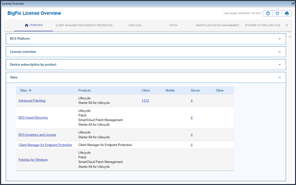 - Overview tab: reports a summary of your BES Platform license status as well as a “License overview”, a “Device subscription by product” and a “Sites” tables.