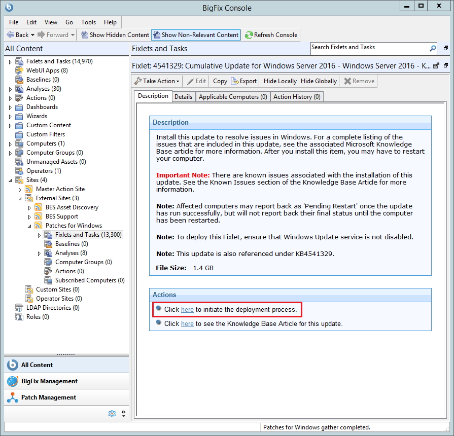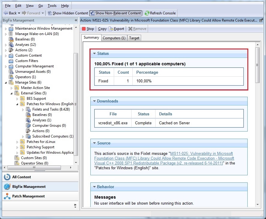 - After the vulnerability is removed the client does not need to apply again the Fixlet and the Fixlet is marked as not-relevant for the client.